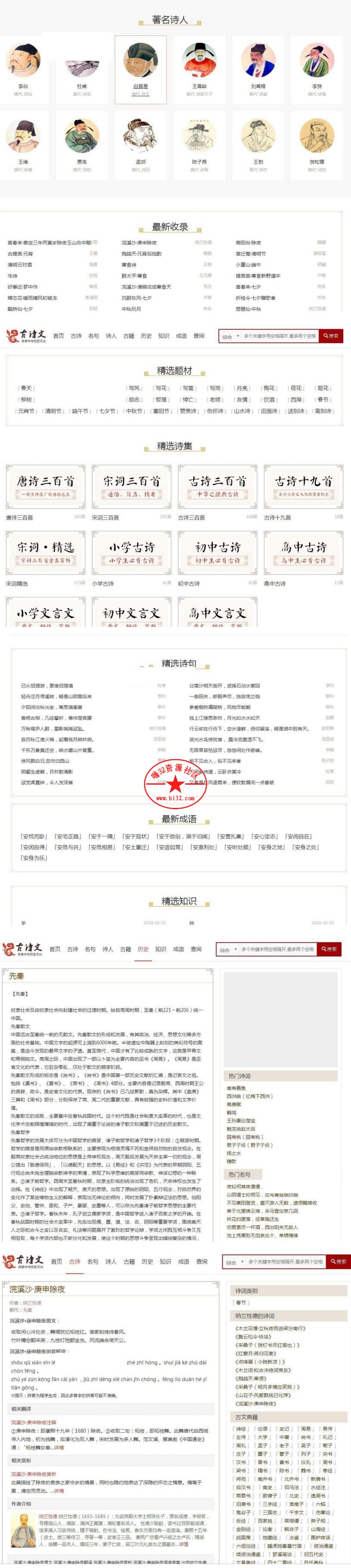 整收录华夏古文学各朝代的典籍,包含古诗词,名言名句,诗人介绍,古书古籍,历史介绍,成语介绍,搭建起来就可以运营了